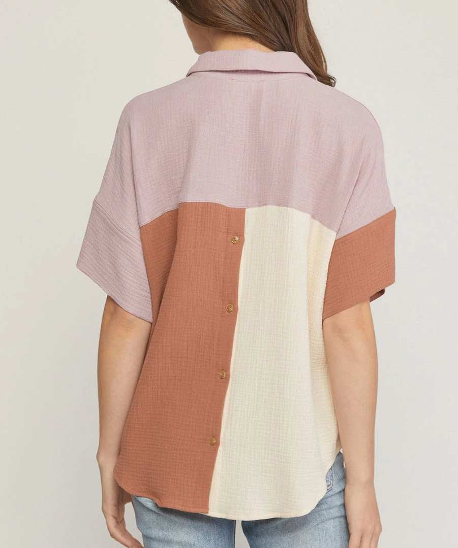 This color block collared top features a v-neckline, short sleeves, pocket at bust and button detailing at the back. Soft, comfy and chic, this top is a must for casual days.