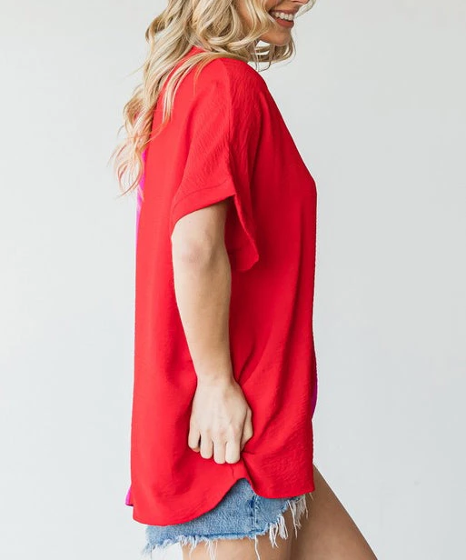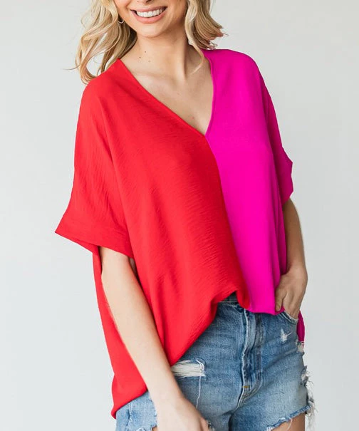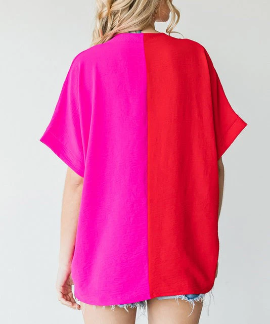 This fun color block top features the season’s must have color combo of red and pink. Featuring a v-neckline, short sleeves and a relaxed fit, this top is a must for work or play.