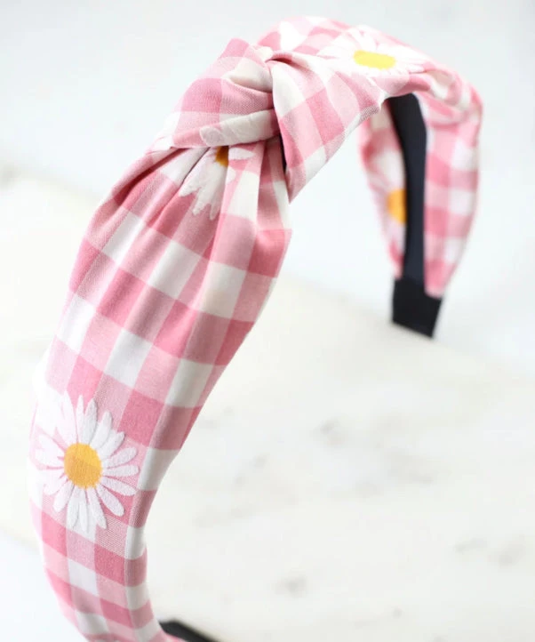 Cutest hair accessory! This headband has a fun gingham and daisy pattern that is a must for spring and summer. The ends are fabric wrapped for comfortability behind the ears.