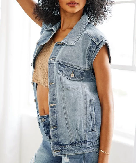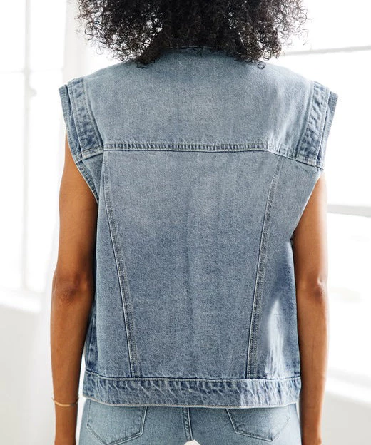 This denim vest is a through back to the 80’s! Featuring exposed button closure, welt pocket pleat at the bottom and a collared neckline, this vest is on trend and so much fun to throw on over a dress or a tee.