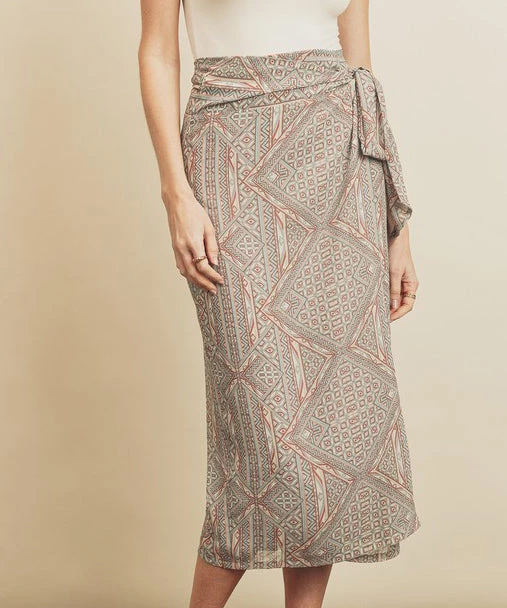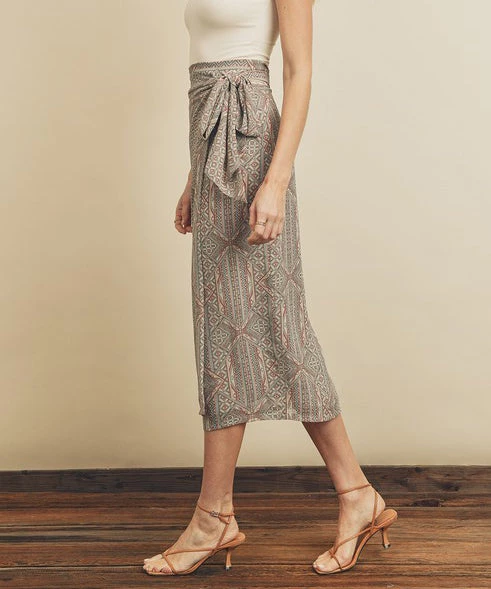 This print midi skirt features a wrapping silhouette with a loop tie fastening on the waist and a midi length. Easy to style for work or play, this skirt is classy and pretty!