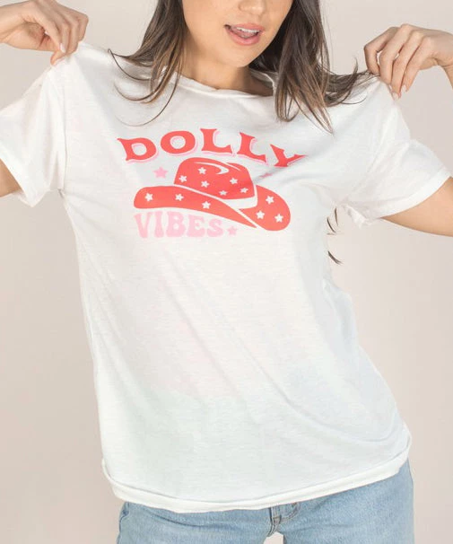 This fun graphic tee is for all the Dolly lovers! Words read “Dolly Vibes”.