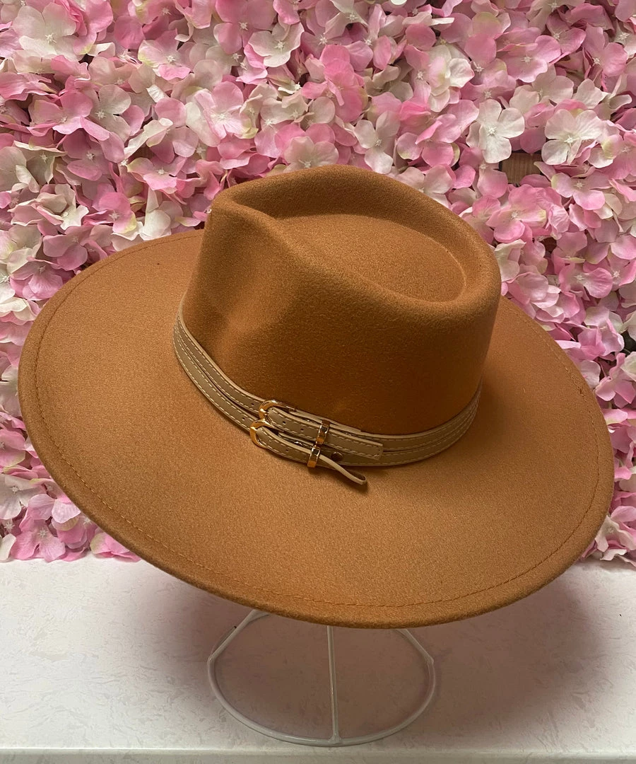 The season’s must have accessory! A classic wide brim hat accented with a double buckle band. This hat is a must to pair back with everything from jeans to sweaters. So cute!