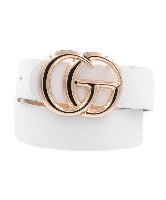 A classic belt with a gold double ring buckle and textured strap. A wardrobe staple.