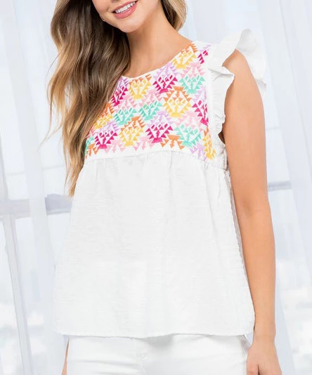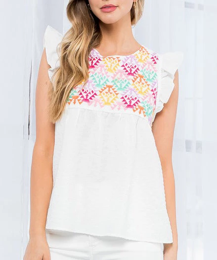 This textured top features the prettiest embroidered detail done in pops of color. Complete with a tassel tie closure in back and ruffle details at the sleeves, this top is the perfect summer piece to wear all season long.