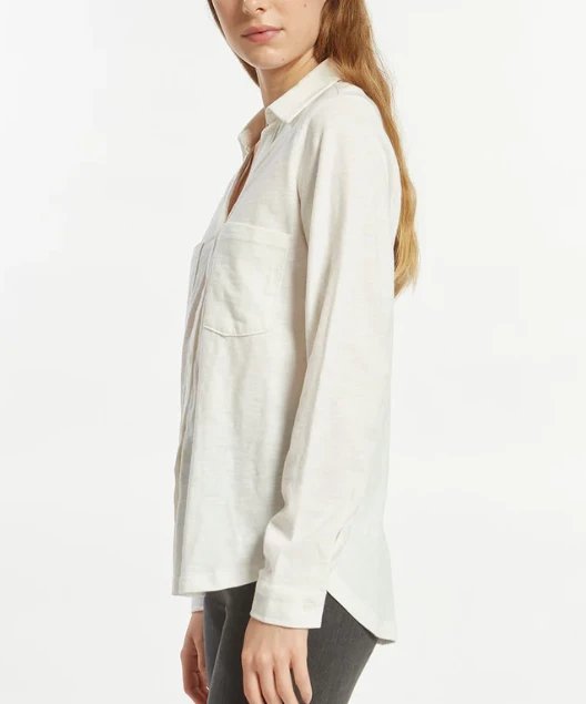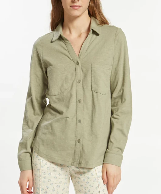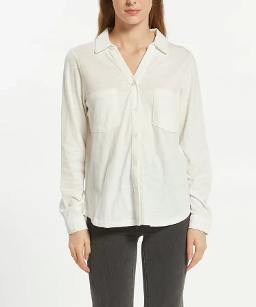 This soft and comfy button down top features a collared v-neckline and dual chest pockets. Casual and chic, this top is a must for work or play.