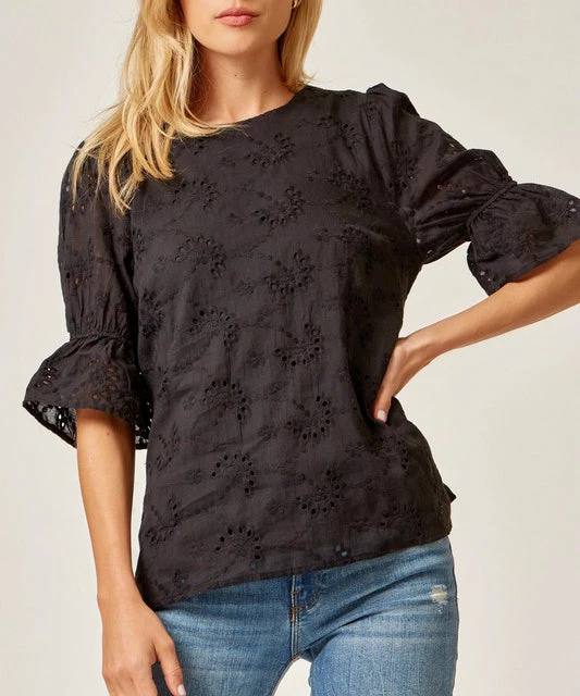 The perfect warm weather blouse! This top features an eyelet pattern, round neckline and short sleeves. Finished in a gorgeous pop of color, this top is a must for work or play.