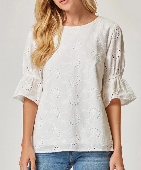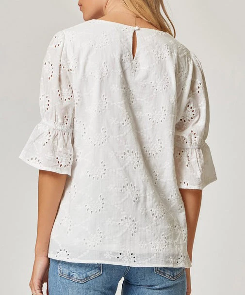 The perfect warm weather blouse! This top features an eyelet pattern, round neckline and short sleeves. Finished in a gorgeous ivory shade, this top is a must for work or play.