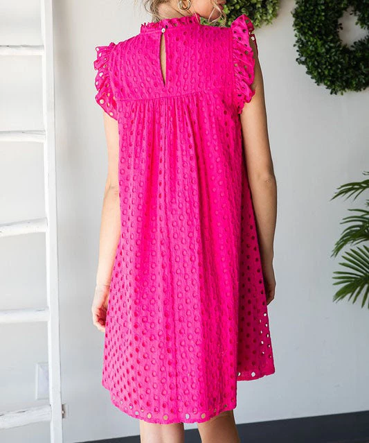 This darling eyelet dress features a frill mock neckline and ruffle cap sleeves. Lightweight and easy to style, this dress is a summer staple.
