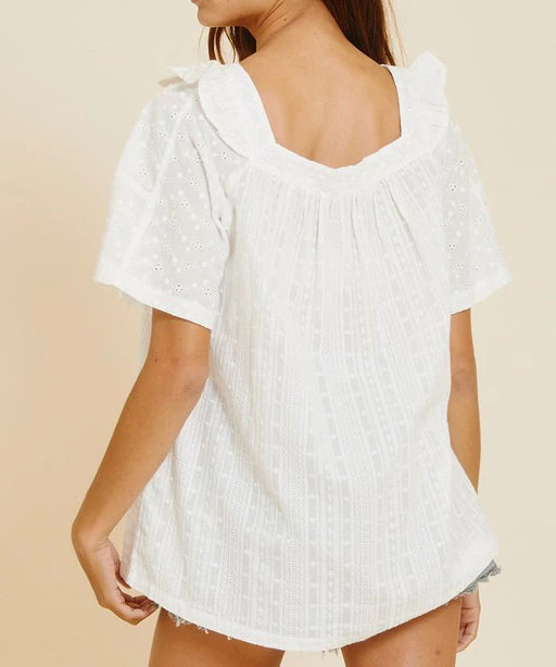 This gorgeous eyelet top features a square neckline, ruffled shoulders and 3/4 puff sleeves with elasticated cuffs. Casual and chic, this top looks so cute with shorts or jeans.