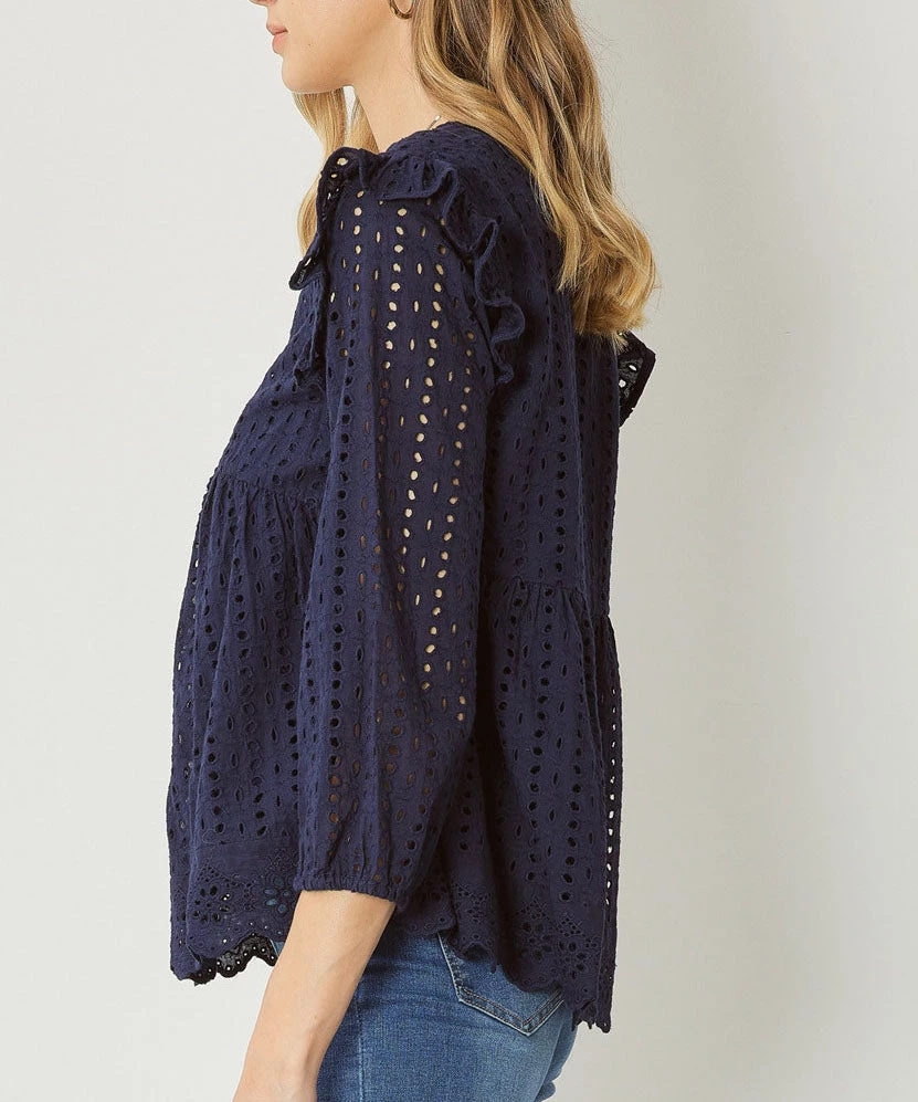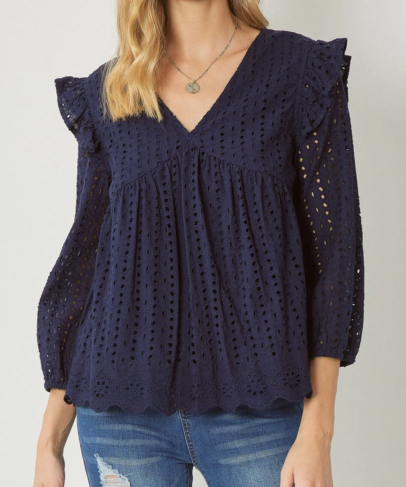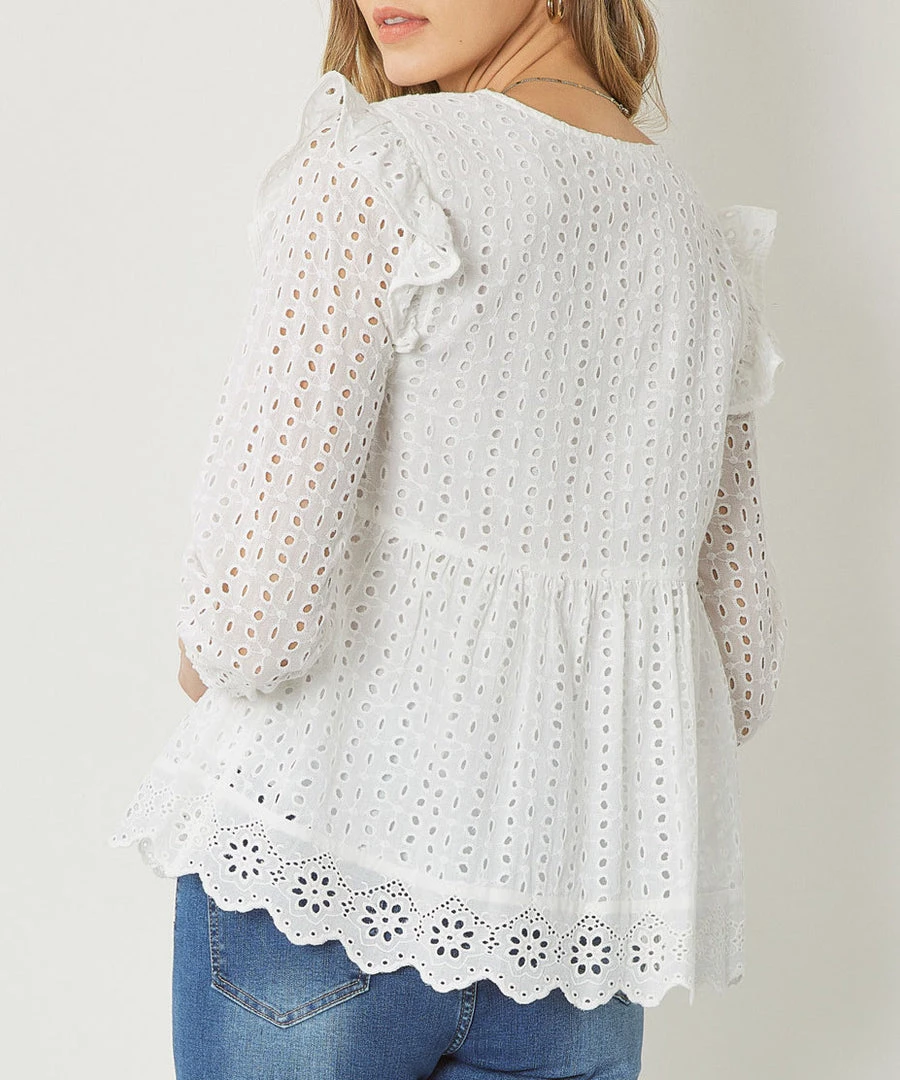 This classic eyelet top features a v-neckline, ruffle detail at the shoulders and elastic at the wrists. A great top for warm weather days.