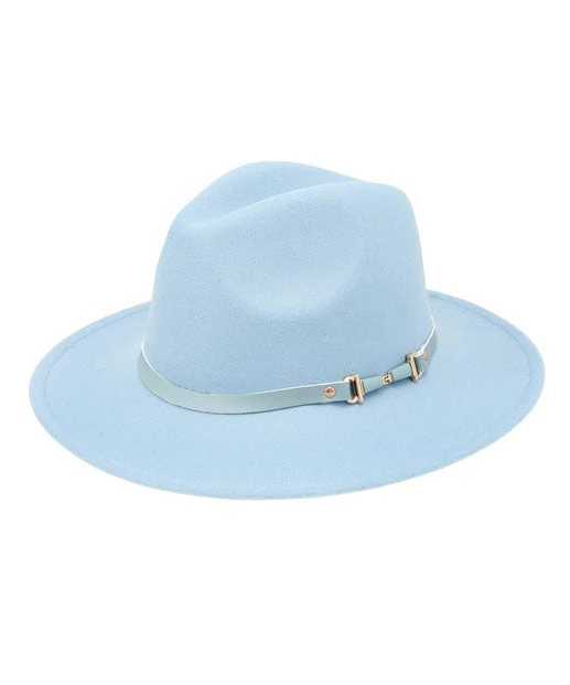 This chic fedora hat is accented with a belt buckle trim. A must to add instant glam to any outfit.