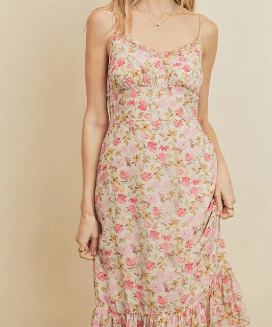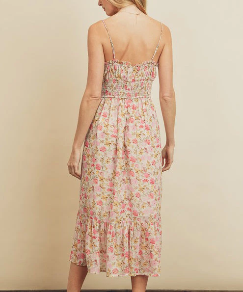 This gorgeous floral print midi dress features a v-neckline with ruffled trim, a ruched bust and ruffled hem. Complete with a smocked panel on the back and adjustable straps for a better fit. So pretty to dress up or down for summer.