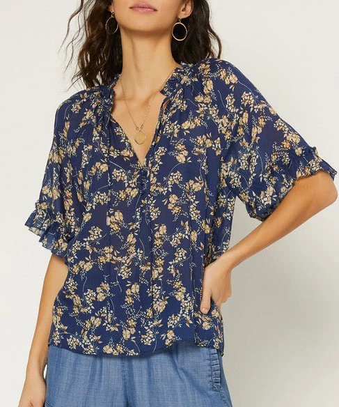 This pretty linen blouse features a floral print, split v-neckline, stitched ruffles and front buttons. Pair with everything from shorts to jeans to skirts for instant chic.