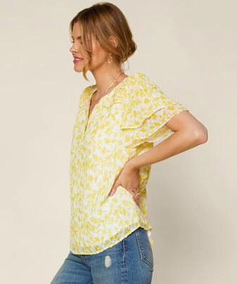 This gorgeous floral print blouse features ruffle detail on the sleeves and a v-neckline. A must for work or play, this blouse is so pretty!