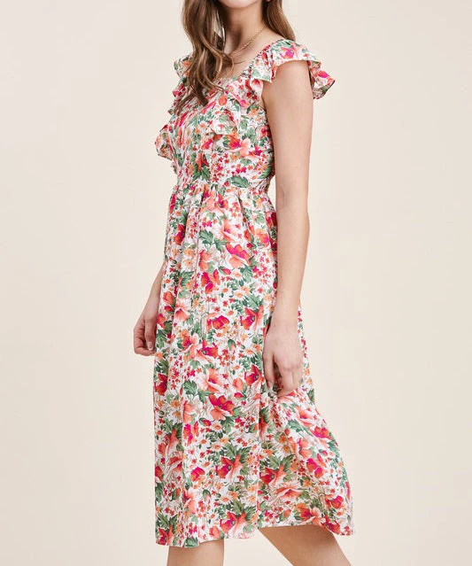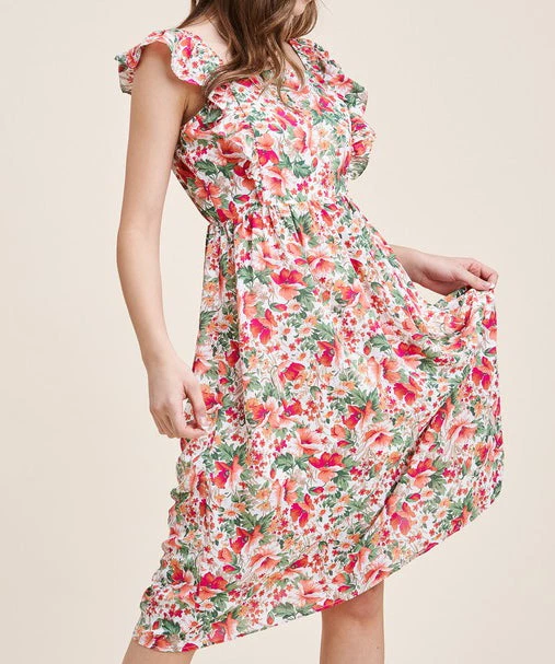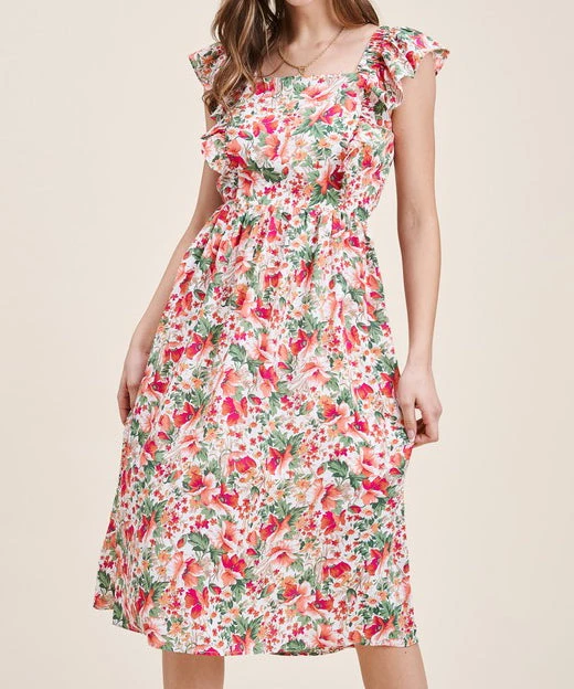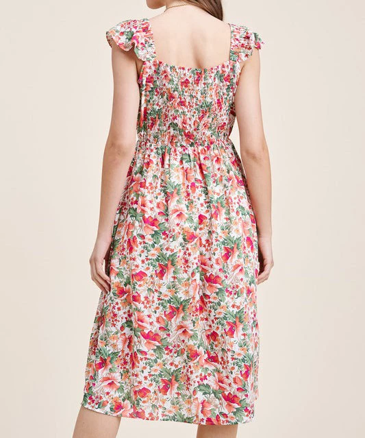 This gorgeous dress features a square neckline, elastic ruffle straps and a smocked back. Feminine, flattering and so pretty!