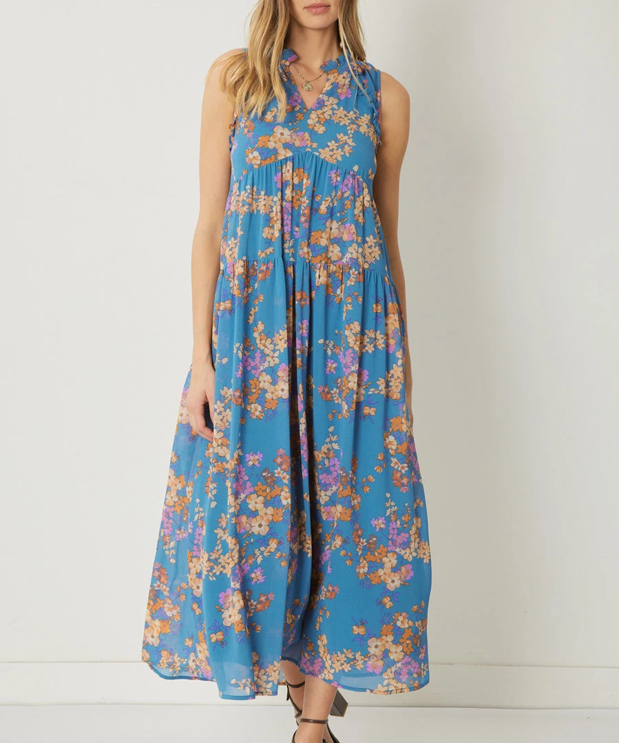 This floral print maxi dress features a v-neckline, a tiered body and a ruffle neckline. Easy to style and comfy to wear, this dress is a must.