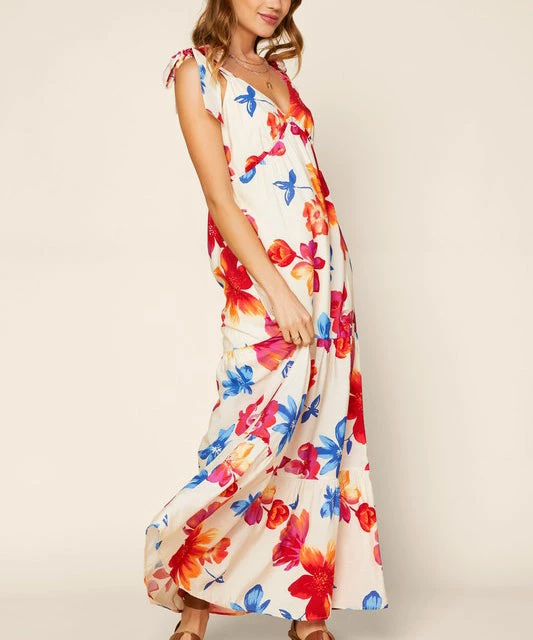 This gorgeous floral maxi dress features shoulder tie detail and a tiered body. A must for warm weather days.