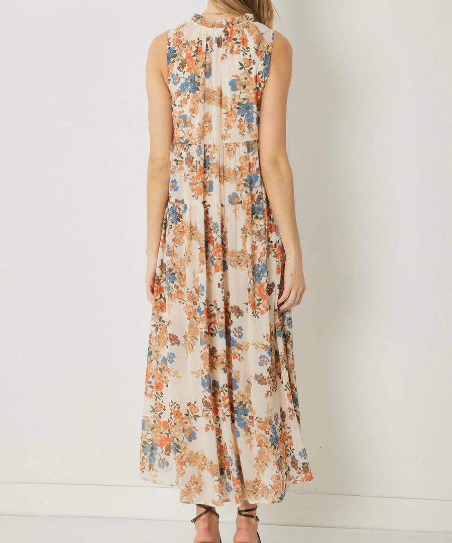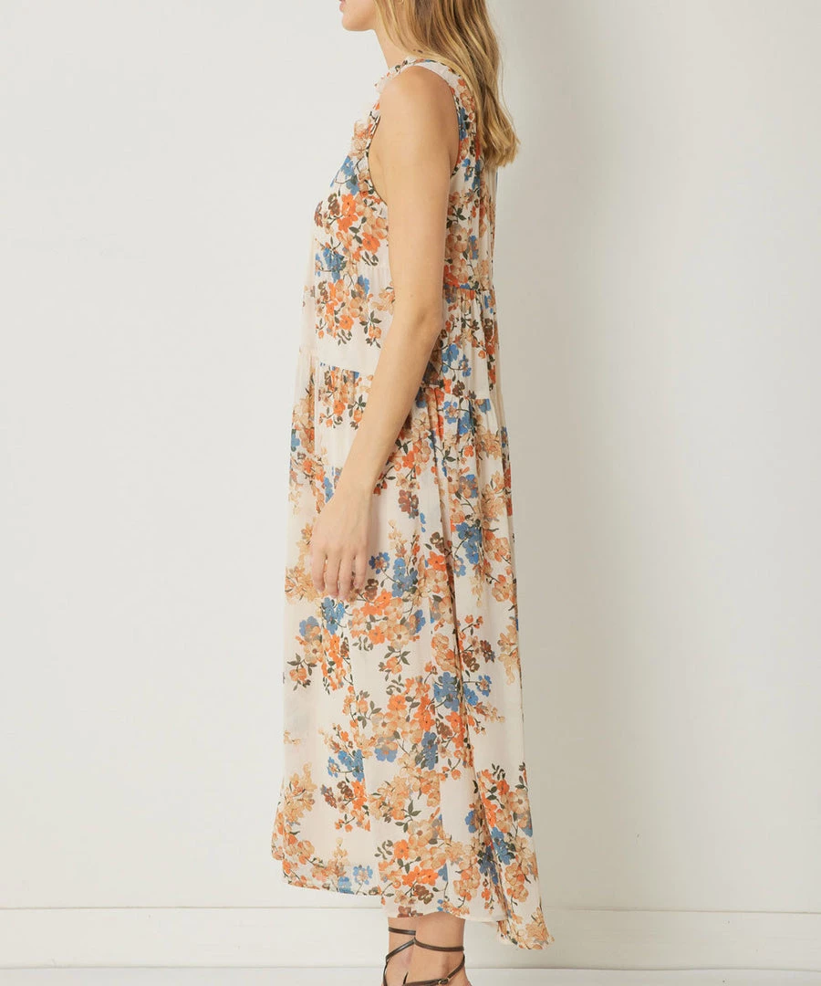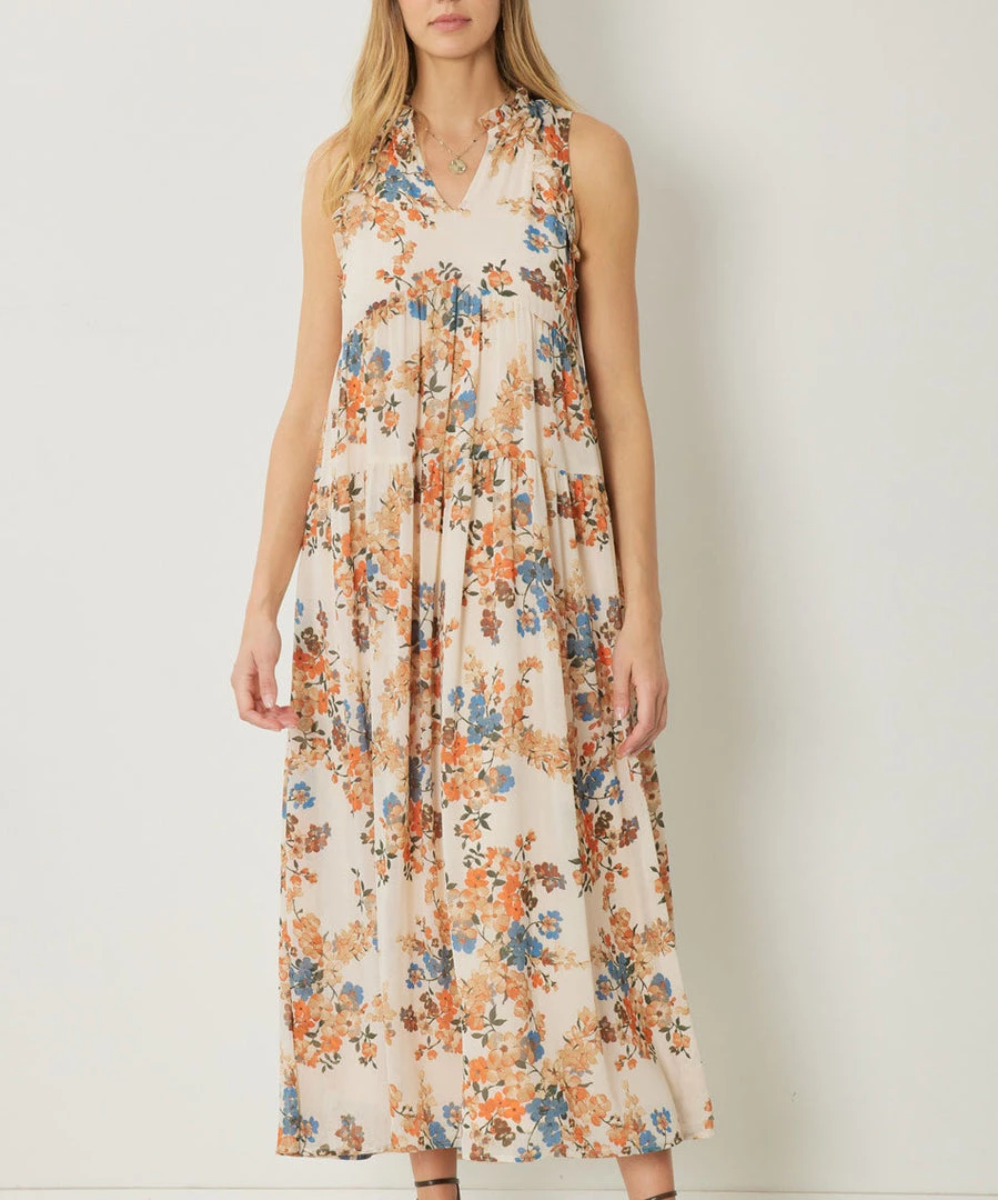 This floral print maxi dress features a v-neckline, a tiered body and a ruffle neckline. Easy to style and comfy to wear, this dress is a must.