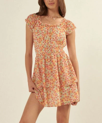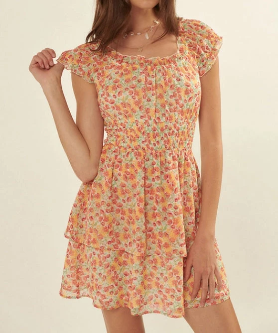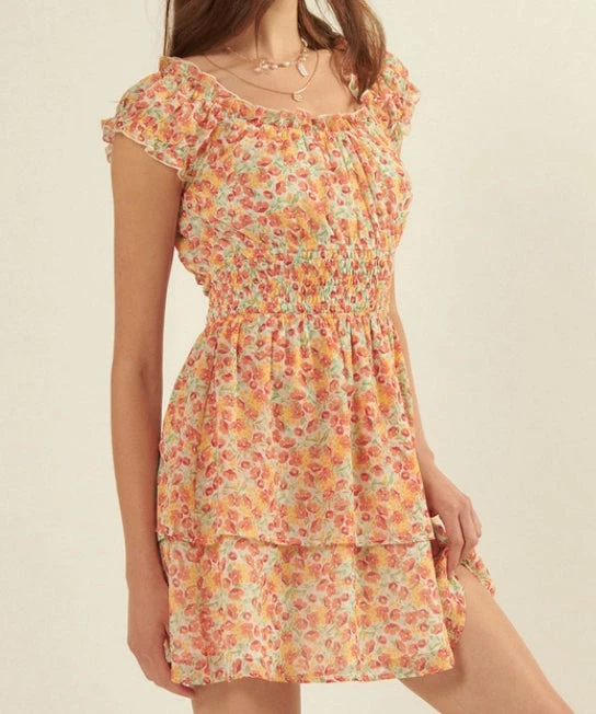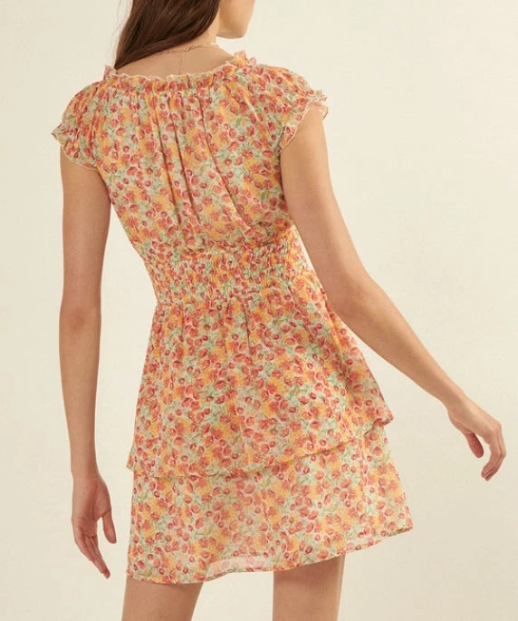 This darling woven floral mini dress features a scoop neckline, cap sleeves, ruffle trim detailing and a tiered skirt. Comfortable, cute and easy to dress up or down, this dress is a summer must!
