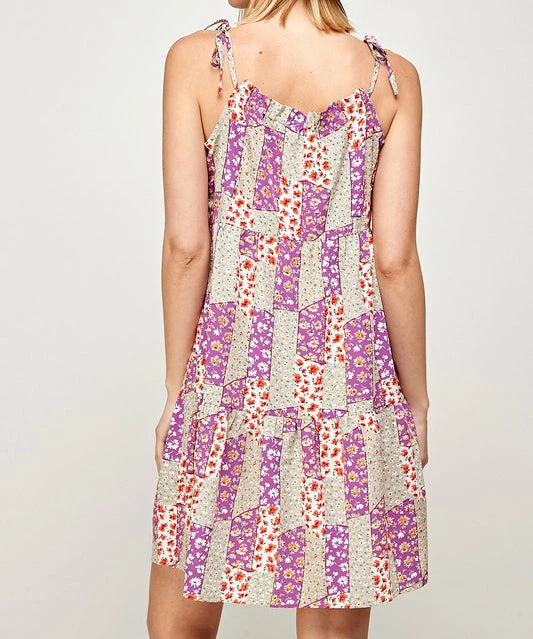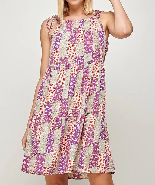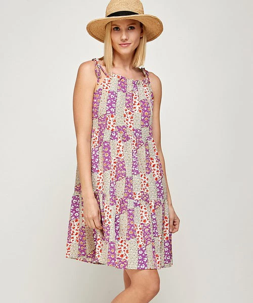 This floral print dress features an a-line body and tie shoulders. Simple, comfy and so cute!