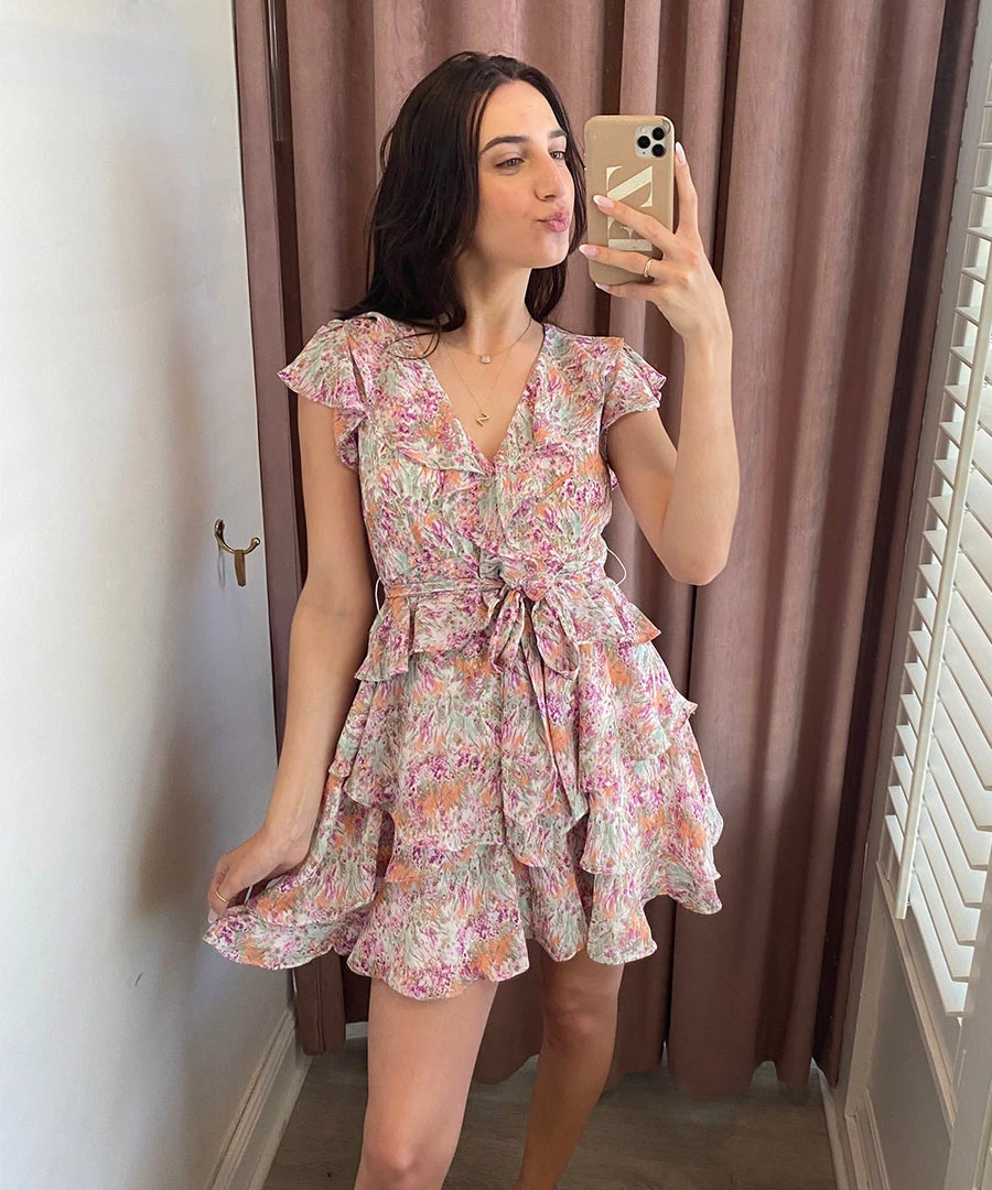 This gorgeous floral print dress features short sleeves, ruffle details and a self tie waist. Feminine, flattering and so pretty, this dress is a must for day or night.
