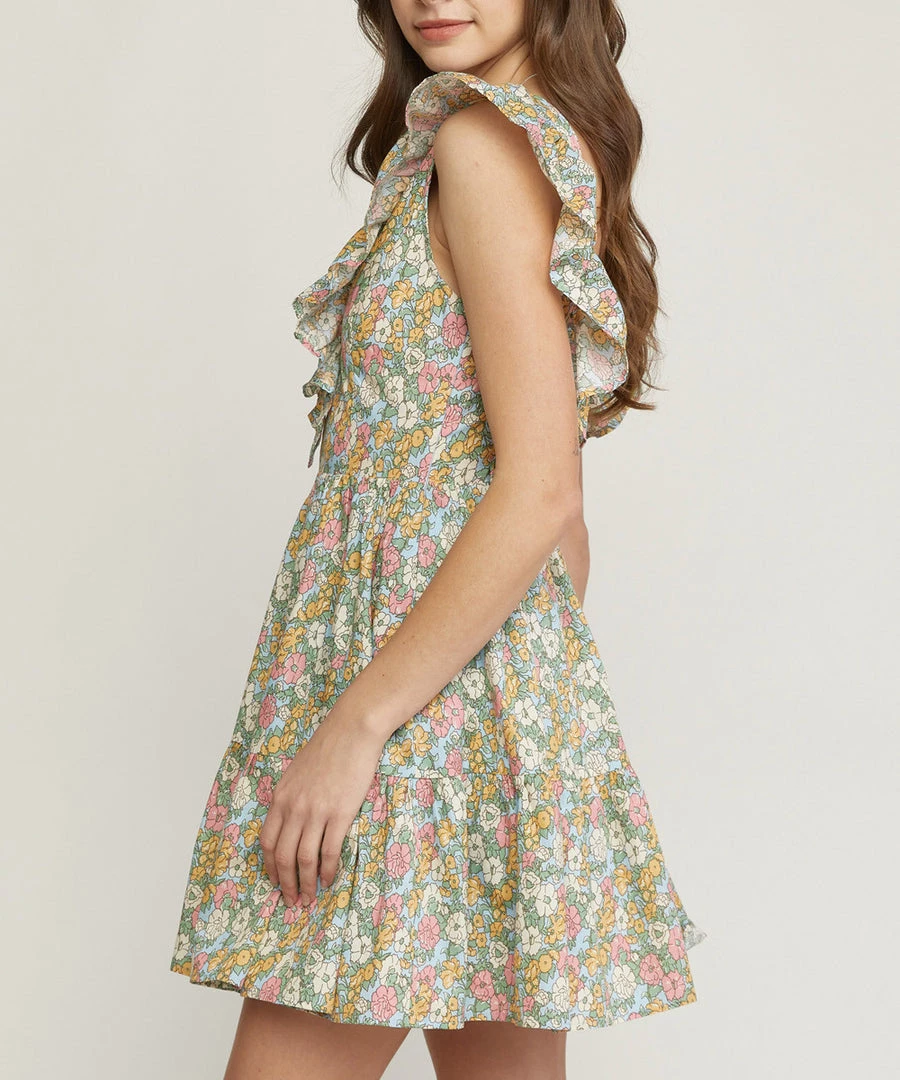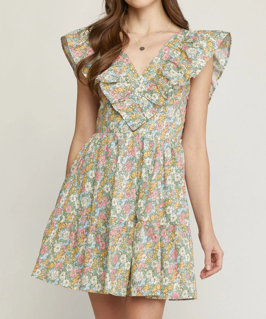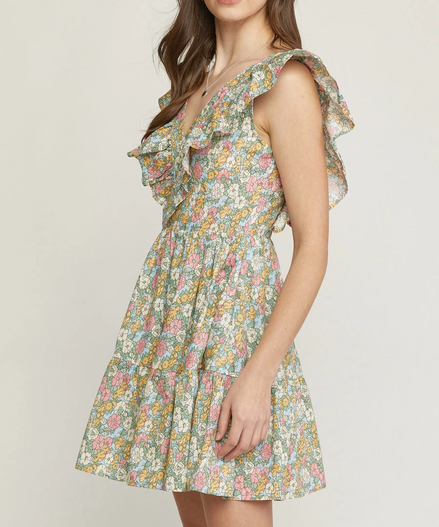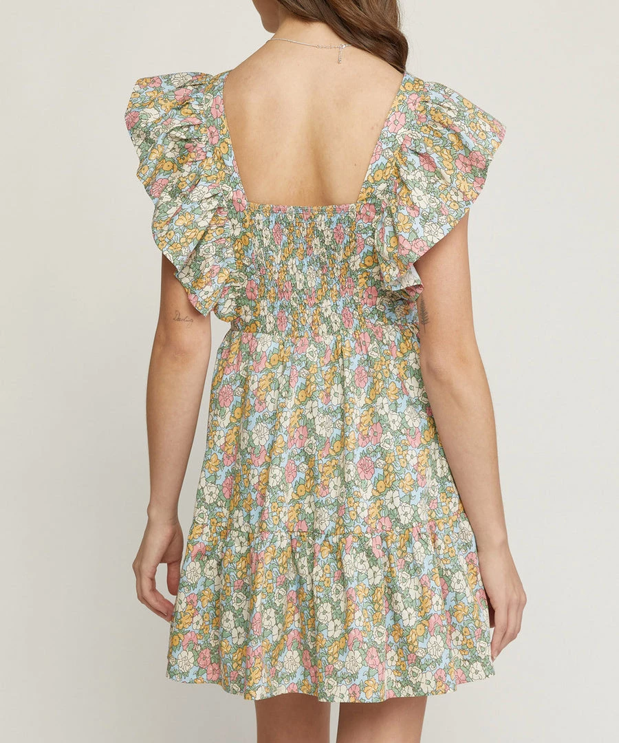 This floral print dress features a v-neckline, ruffled butterfly sleeves and smocking at the back for a comfy and easy fit. A great dress to take from day to night in summer.