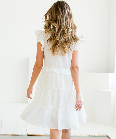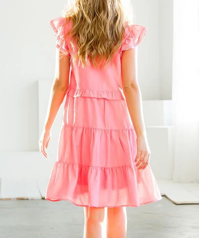 This pretty flutter sleeve dress features a tiered body and trim detail on the sleeves. Easy to dress up or down, this dress is flattering, comfy and easy to style.