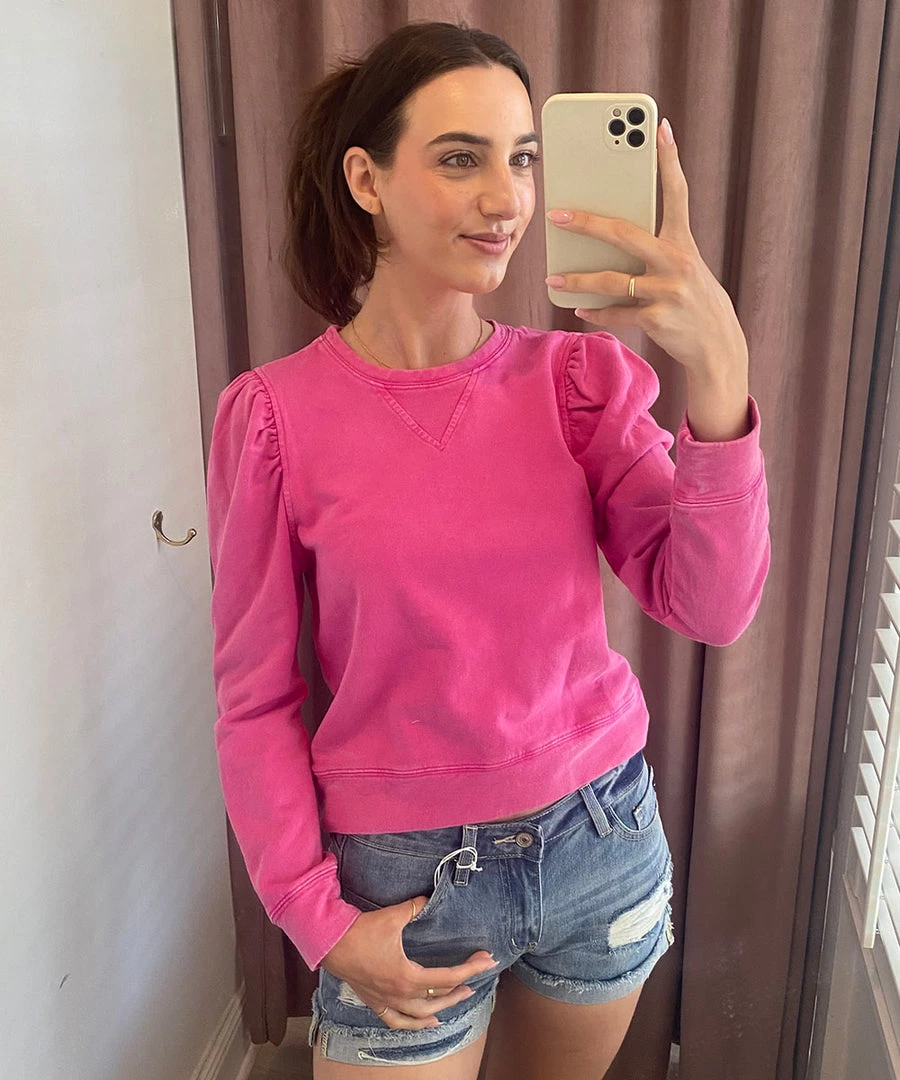 This soft and comfy pullover top features a mineral washed material and long puff sleeves. A must for casual days, this top looks so cute with everything from shorts to jeans to leggings.