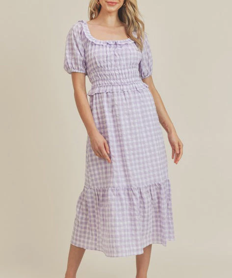 Gingham is a must for spring and summer! We love it here on this pretty dress featuring ruffle details and short sleeves. A must for casual days on a warm day.