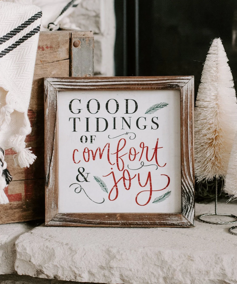 Decorate for the most wonderful time of the year with this Good Tidings of Comfort and Joy wood sign. This hand lettered rustic sign is painted with a beautiful cream paint and is handmade – each sign is unique. Sign reads: “Good Tidings of Comfort”
