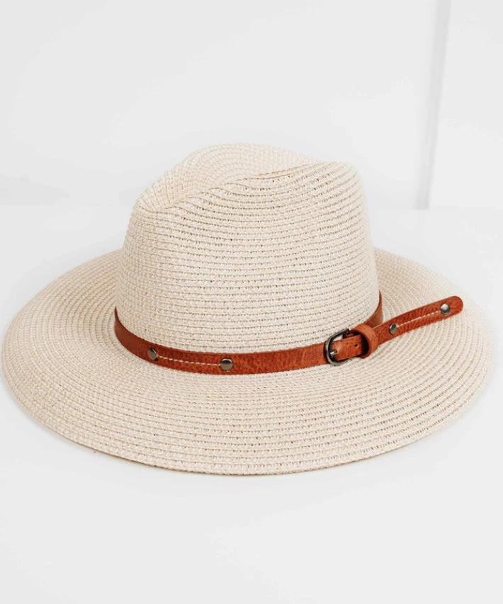 The Grayson Packable Sun Hat is a fun and easy to bring style sun hat with a thin belted brown band. This fun summer hat is giving us all the excitement for warmer weather, beaches and sundresses.