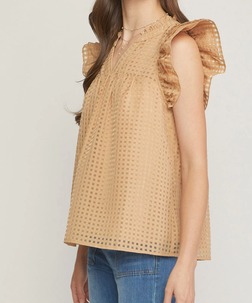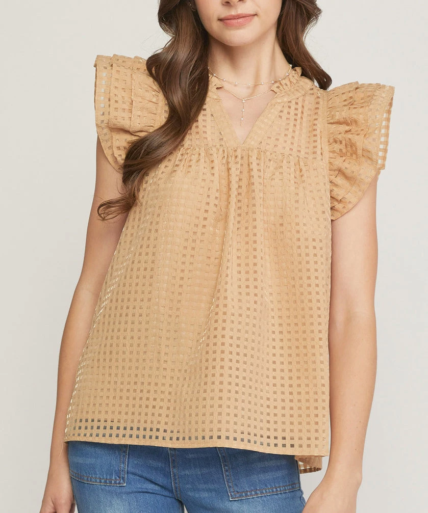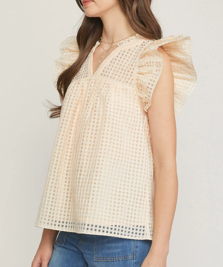 This darling top features a grid print and ruffle detail on the sleeves. An easy top to wear for work or play, this one is polished, on-trend and chic!