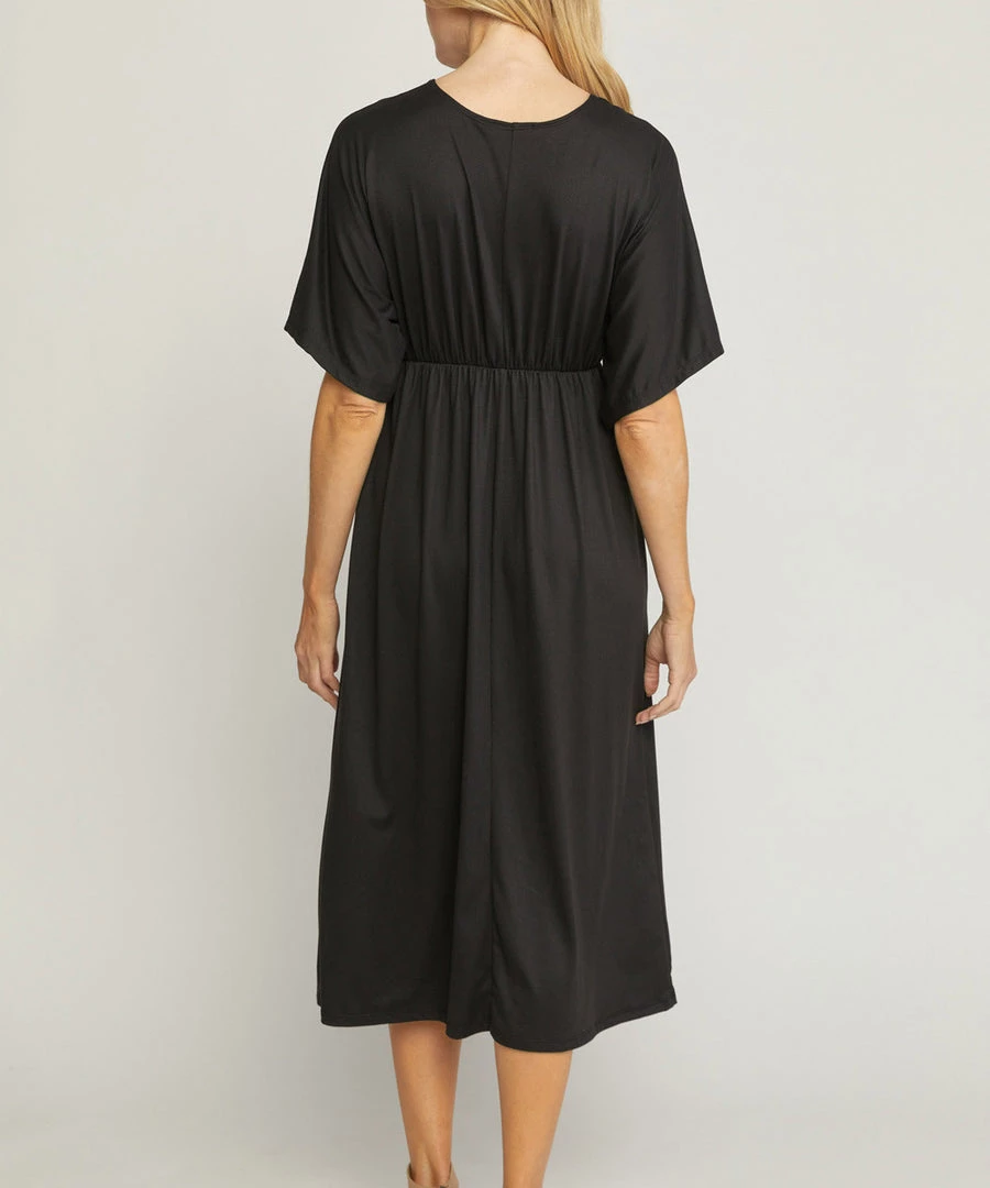 The perfect summer staple! This midi dress features a 1/2 sleeve with knot detail on the front. Soft, comfy and easy to style, this dress can be taken from day to night. A classic maxi dress updated with a fresh look.