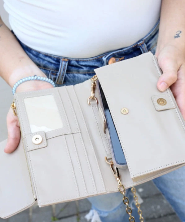 This wallet crossbody is a great versatile piece to own. It features flat, circular studs on the front with a foldover magnetic closure. There are several card slots inside as well as a clear ID holder. It also has a pocket for your cell phone. The best part of this wallet is the removable chain strap which allows you to carry it as a crossbody, clutch, or wallet.
