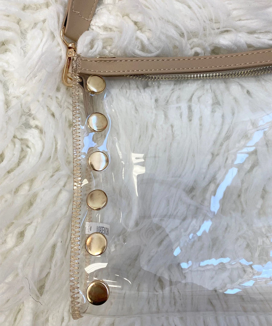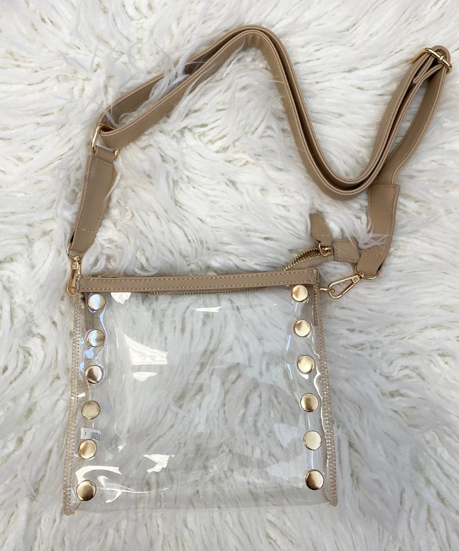 This chic clear bag is absolutely perfect for Game Day and concerts! It has gold stud accents along the sides of the bag. The crossbody strap has a vegan leather strap to keep from slipping off your shoulder.