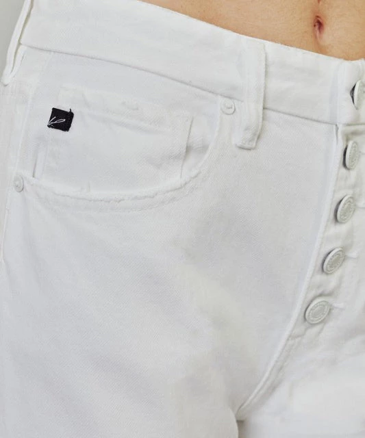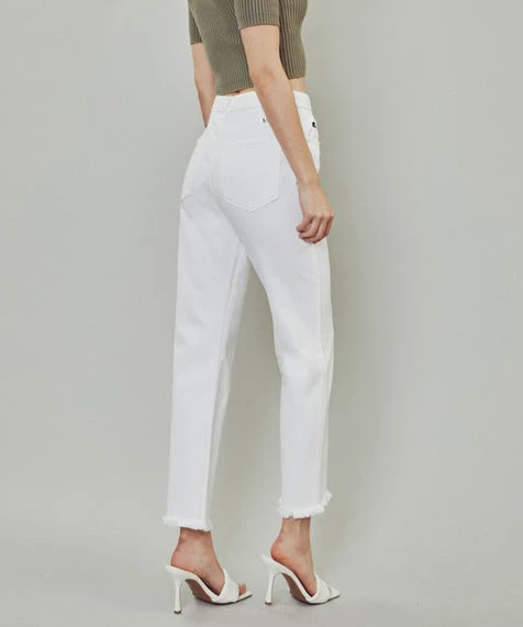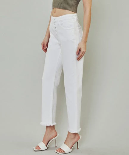 These high rise jeans feature a straight leg with a frayed hem, and button front. Stretchy, soft and comfy, this jeans are a must to wear all season long. A great fit!