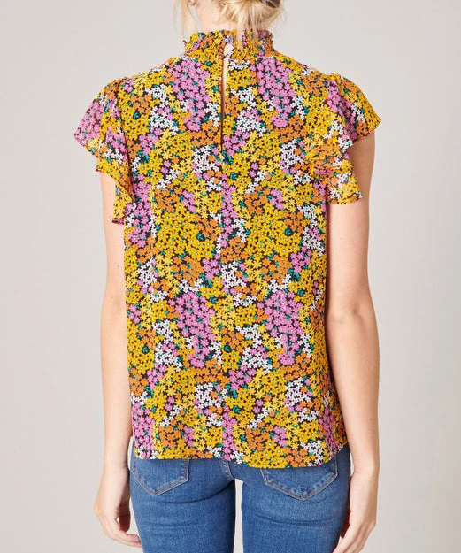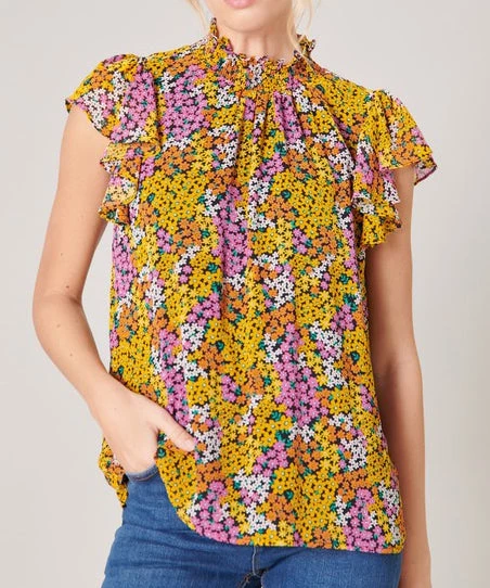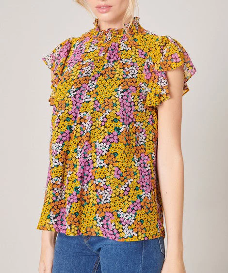 This smocked mock neck top features flouncy cap sleeves, a relaxed fit and a fun print. A must for work or play.