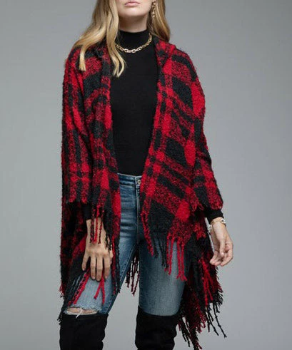 This soft and plush plaid poncho features a hood and fringe detail. A must to layer with all season long.