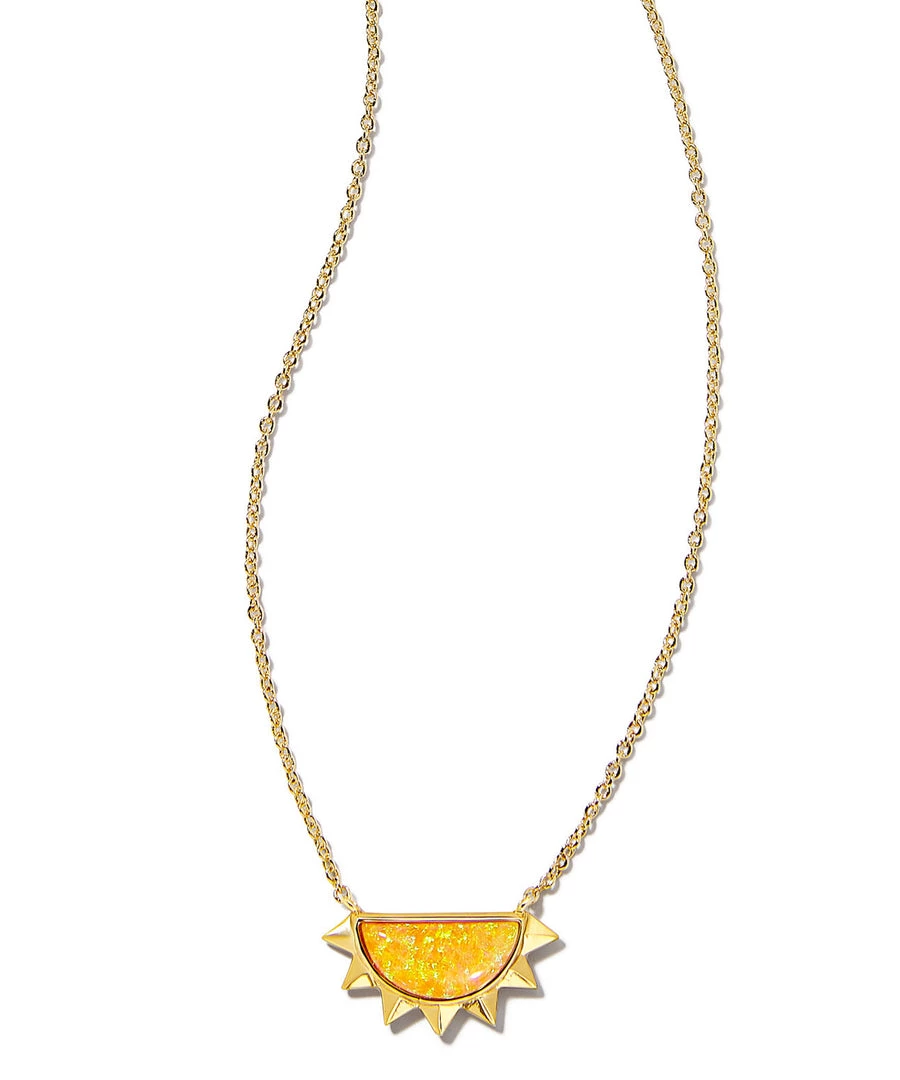 Bring on the (sun)shine with the Sienna Gold Half Sun Pendant Necklace. Featuring a colorful half sun motif inlaid with a one-of-a-kind Citrus Kyocera Opal stone and a versatile sliding clasp so you can style at any length.