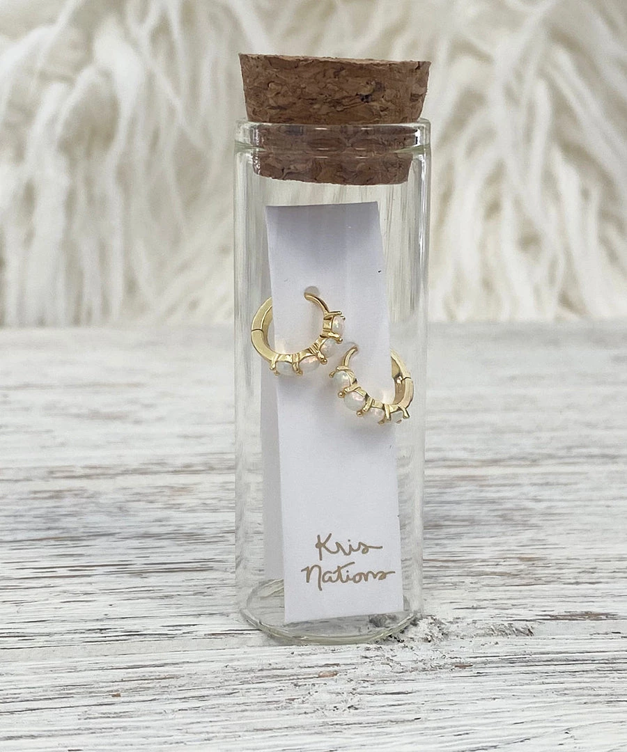 These opal and gold huggie earrings measure 13mm round with 3mm stones. A must for everyday wear.