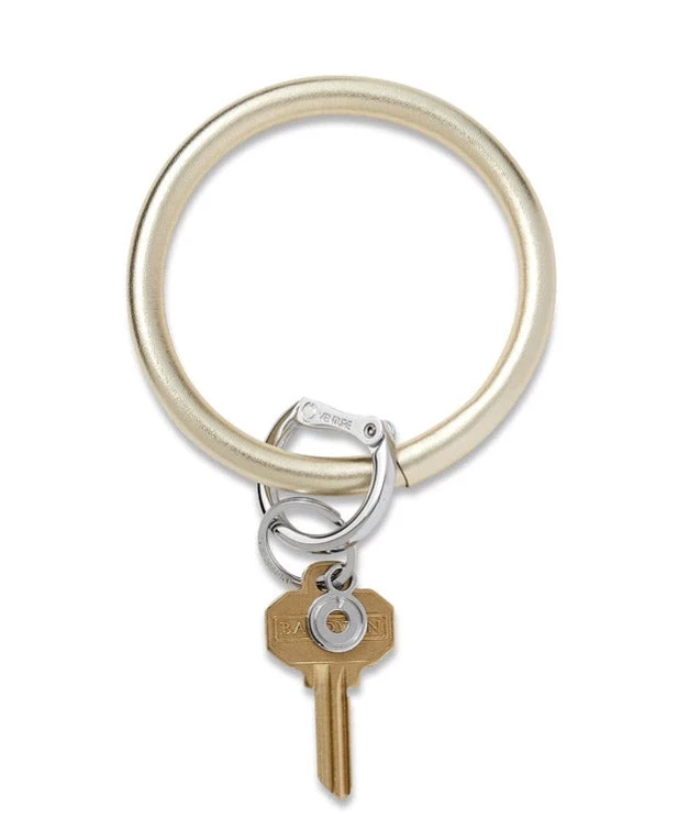 Fabulously dazzling yet surprisingly neutral, this metallic leather is durable, seasonless, and promise to play nice with your signature stack of bracelets. The Original Big O® Key Ring is a one-size-fits-all bracelet key ring that can be worn on your forearm or above your elbow for hands-free ease. The patented, signature locking clasp clicks open and closed so you can contain your house keys, car keys, card case and more in one central, secure location.