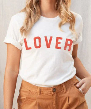 Cutest graphic tee for Valentine’s Day and beyond. Wording reads “Lover” in red. Soft, comfy and cute!