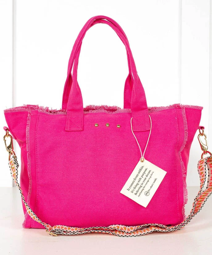The Luna Fringe Canvas Crossbody Tote is your everything hold all for a day out on the town, running errands, to the office or gym! It’s all in the details. This new bag features hand-made fringe edges, matching bag bottoms, coordinating bag straps, a zipper top closure, and two inner pockets! This stylish bag has a large main compartment featuring a tote style with handles and a crossbody strap. The handles are strong and comfortable making this trendy and functional crossbody tote bag. W