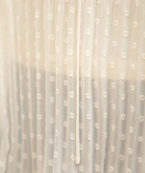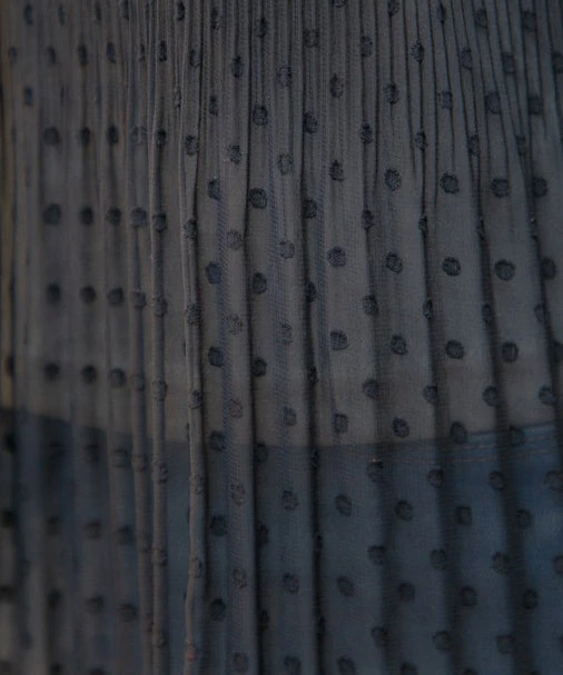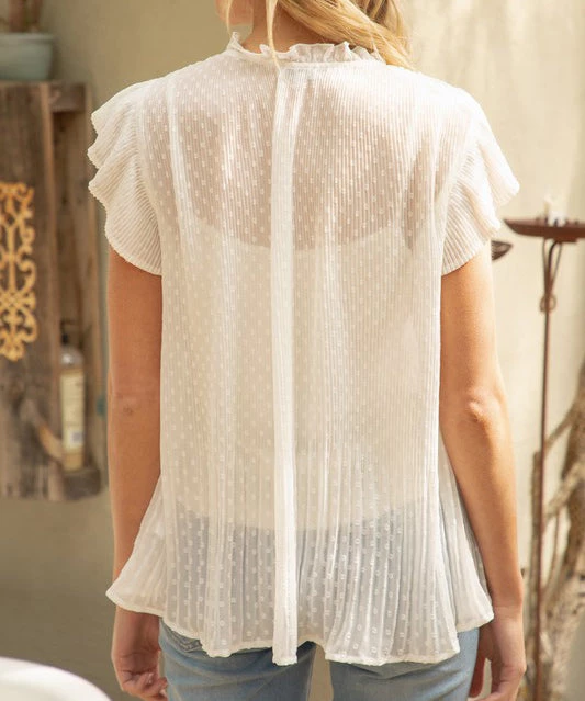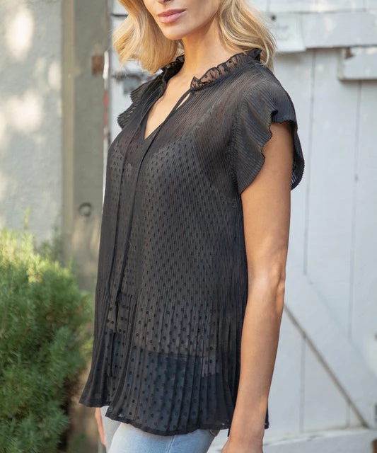This gorgeous blouse features a polka dot texture, pleated detail and ruffle detail on neckline and sleeves. A must for work or play, this top can be worn with everything from jeans to pants to skirts.