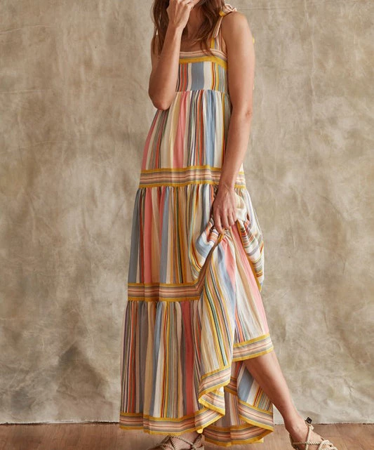 This gorgeoyus stripe maxi dress features the prettiest color combinations of pink, mustard and blue. Comlete wtih a straight neckline and knot shoulder ties, this dress is effortlessly chic and a summer must have.