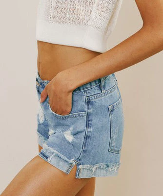 Classic mid-shorts are always in style. These cuties are a must for summer days. Featuring distressing details and a single fold hem.