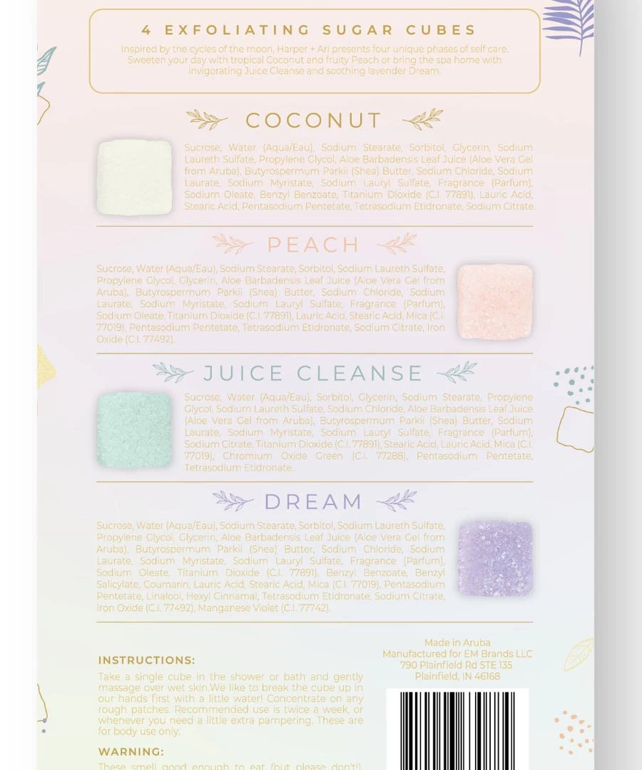 Inspired by the cycles of the moon, Harper + Ari presents four unique phases of self care. Sweeten your day with tropical Coconut and fruity Peach or bring the spa home with invigorating Juice Cleanse and soothing lavender Dream.