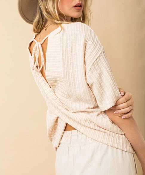 This soft and comfy top features a textured feel, short sleeves and a back overlap detail that is on trend and so chic. Self tie in the back completes the look. A summer staple!