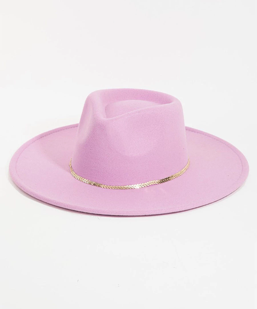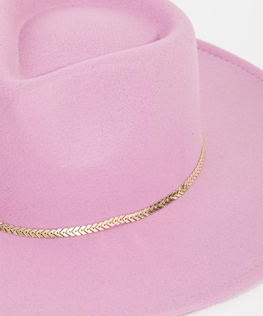 A statement hat for spring and summer. This pink color is simply gorgeous. Accented by a gold chevron chain link band, this hat is the perfect finishing touch to all of your looks.